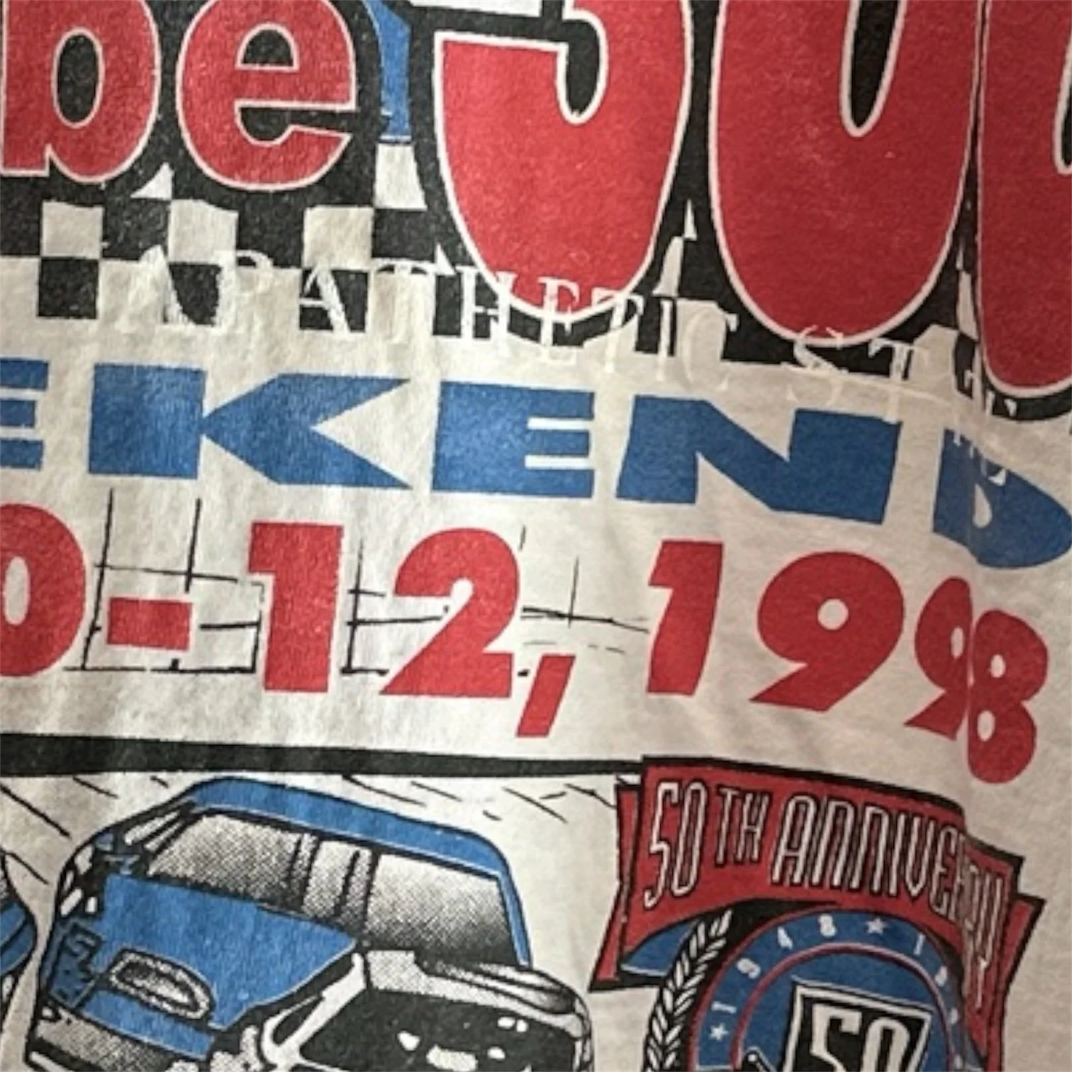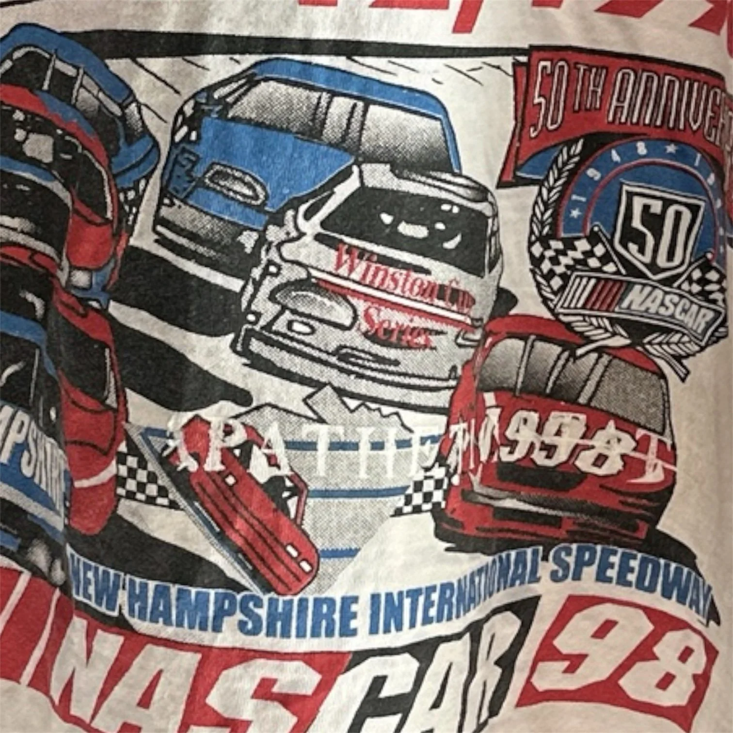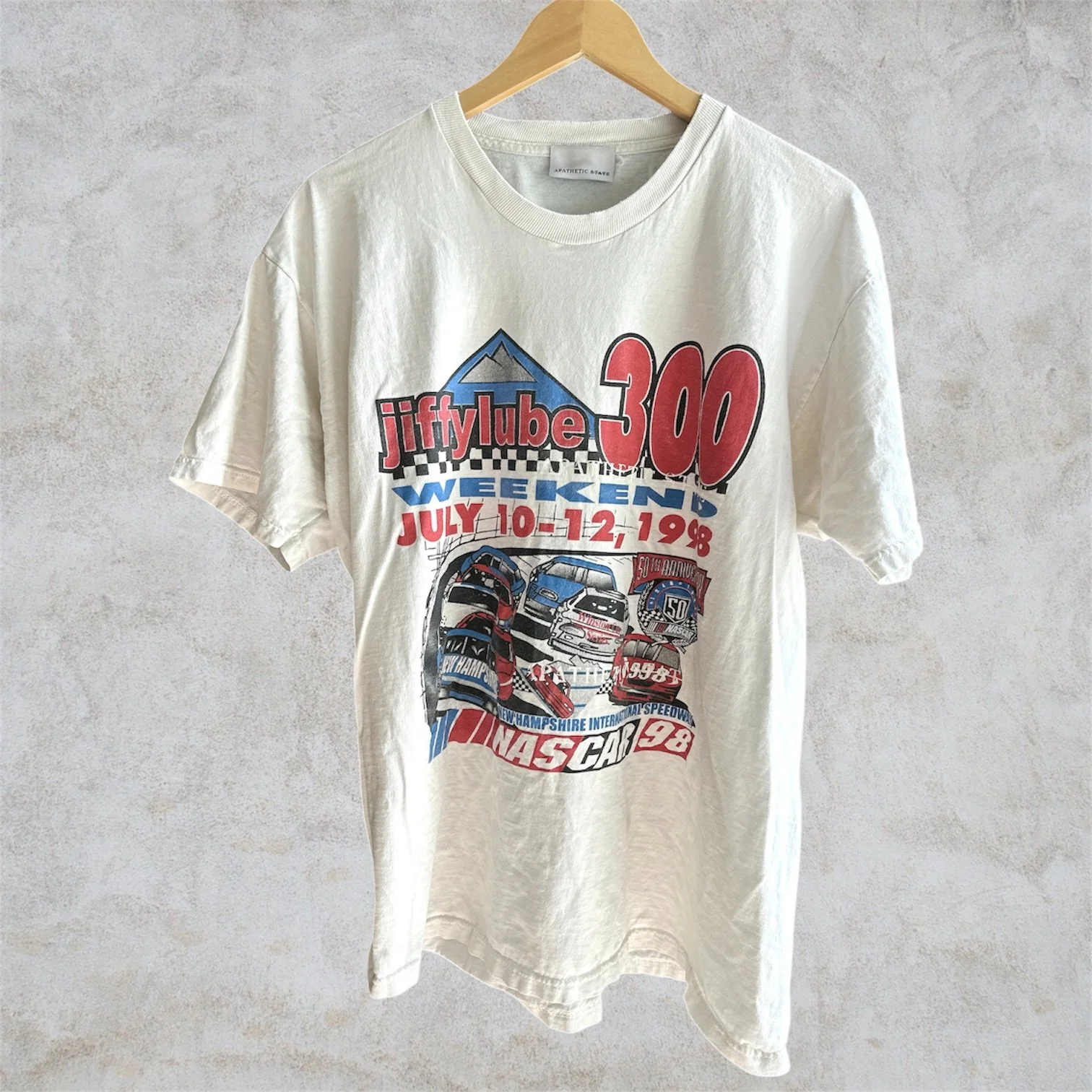 Vintage 90’s NASCAR Tee. With over printed APATHETIC STATE screen print graphic over NASCAR graphics. Mid weight, broken-in fabric. Screen printed graphic on front. Nice vintage wear, and markings