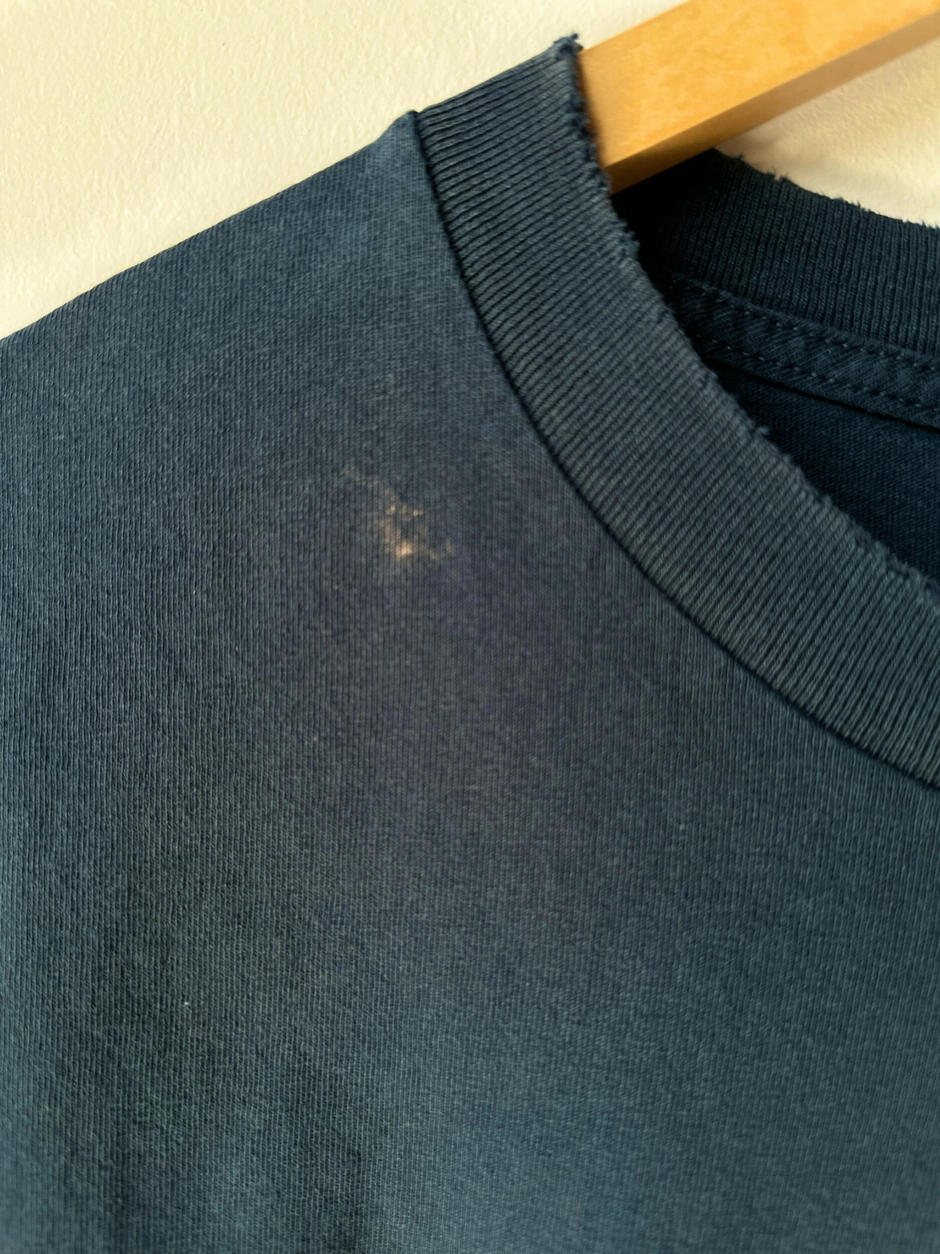 90’s Vintage Oversized Fade. Heavier Weight Broken-in Fabric. Great Fade, and Wear! Cool markings, distressing around ribbed neckline. Small hole on bottom front. Great piece. 90’s nostalgia.
